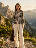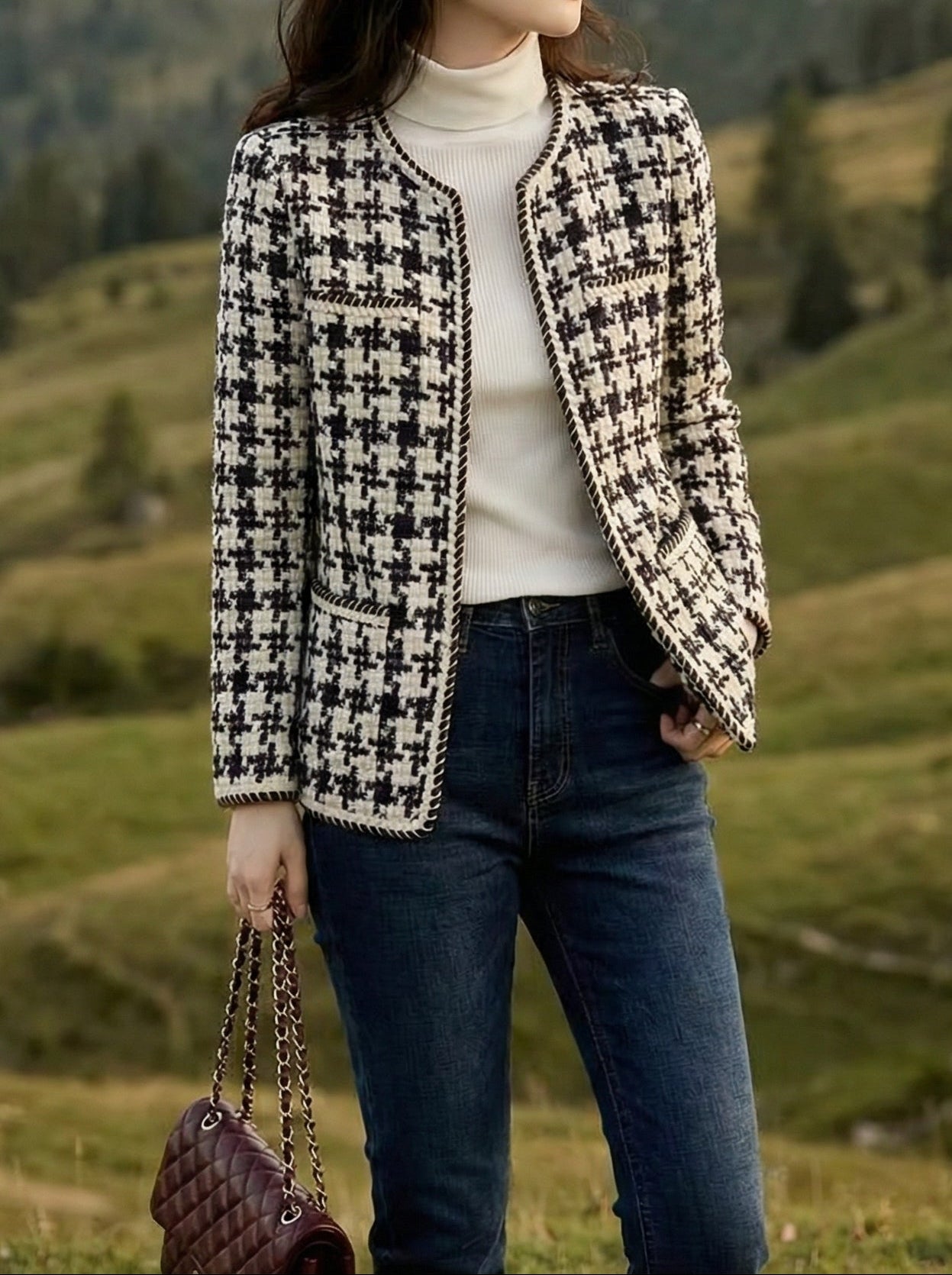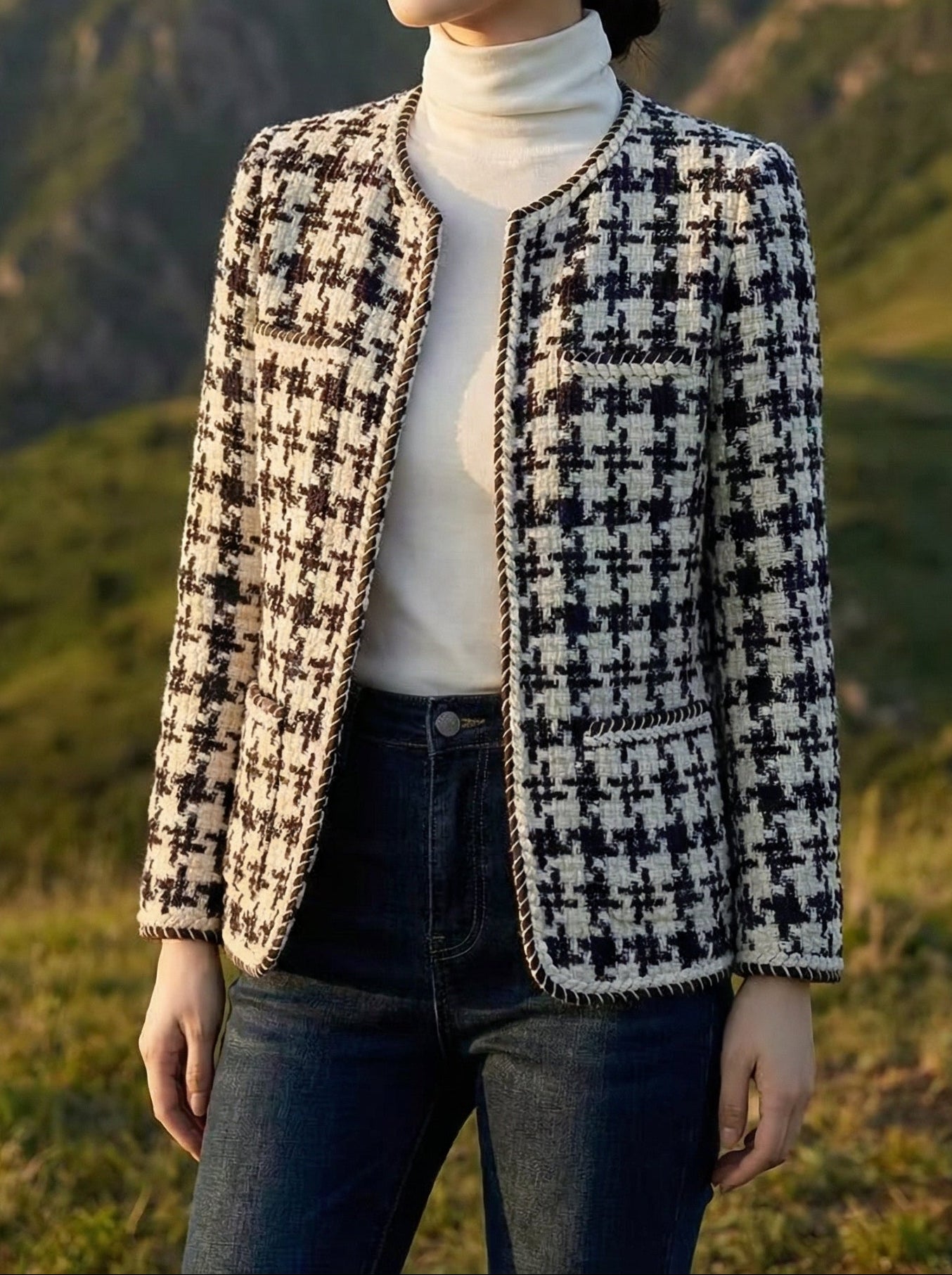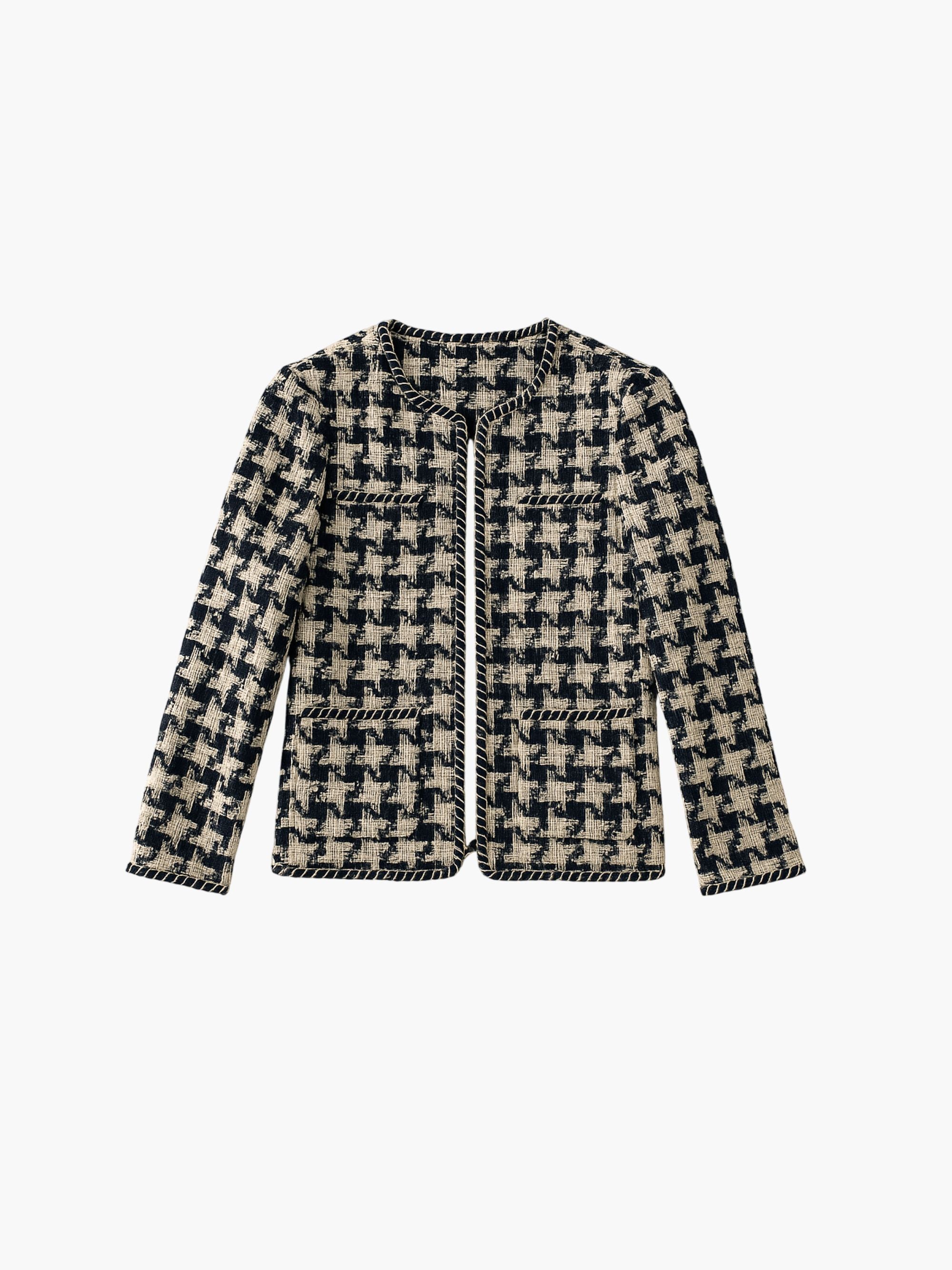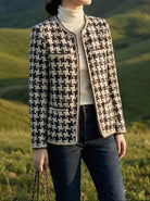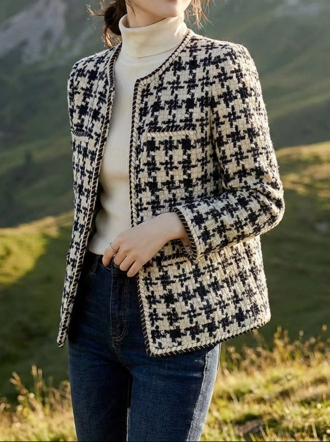 A refined old money tweed blazer with a classic houndstooth pattern and color-block details for a timeless, elegant look.