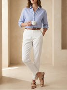 Introducing the Old Money Cotton Striped Button Front Shirt, an elegant addition to your wardrobe for spring, summer, and fall. This long-length shirt features a classic polo collar and three-quarter-length sleeves, striking the perfect balance between style and comfort. The timeless striped pattern, paired with button details, adds a sophisticated touch to this versatile piece.