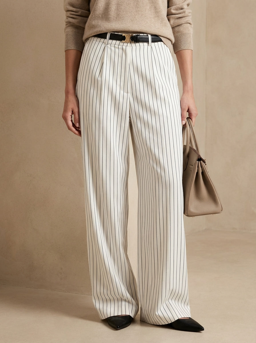 A refined old money wardrobe staple: elegant striped wide-leg trousers made from a smooth polyester blend with a clean drape and tailored shape.